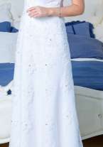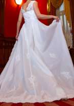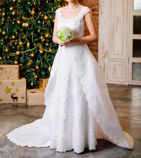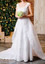 Платье с шикарным кружевом, расшитым бисером, стразами, жемчугом.Платье чуть расширено к низу. Отдельно на талию пристегивается юбка, трехслойная, верх расшит кружевом платья. Великолепно смотрится на фотосессии и на регистрации. В ресторане юбку можно отстегнуть.