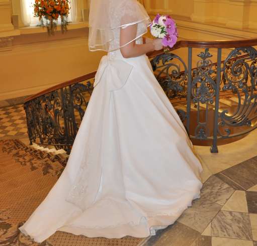 Платье покупалось в салоне. Корсет на шнуровке, юбка из атласа, верх отделан вышивкой. Платье очень удобное. В хорошем состоянии, после химчистки. В подарок отдам кринолин на 2 кольца, болеро и фату)