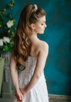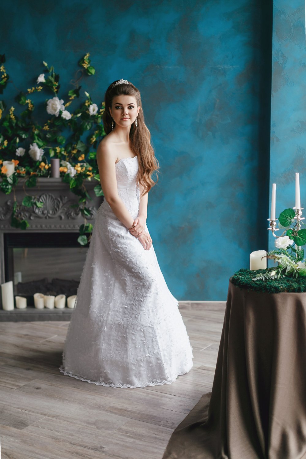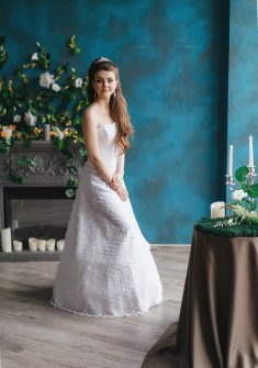 А-силуэт. Ткань: "Живой" гипюр. Корсет на шнуровке, так что подойдёт и скорректирует любую фигуру. Без повреждений и дефектов, после химчистки.