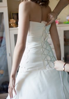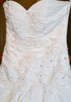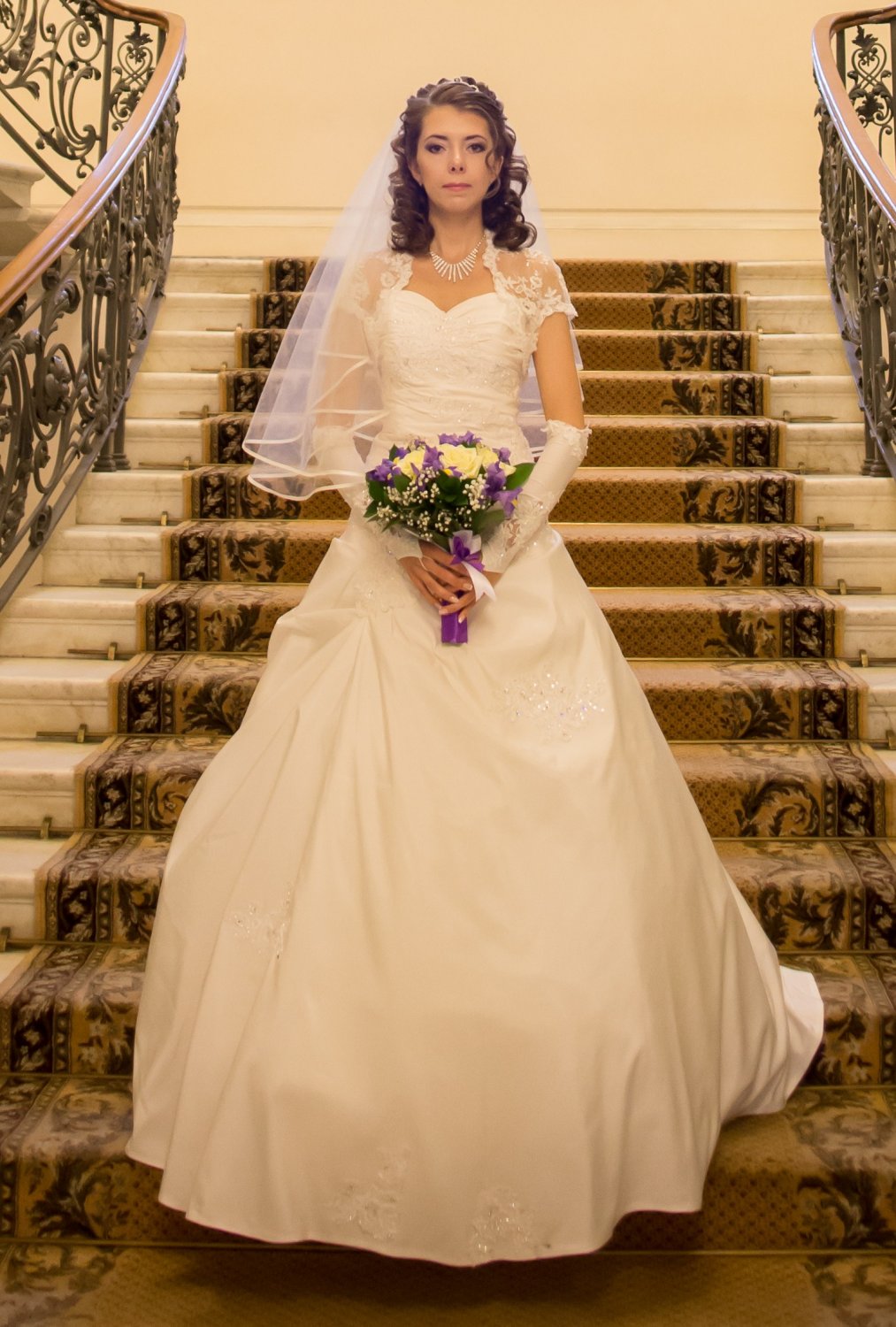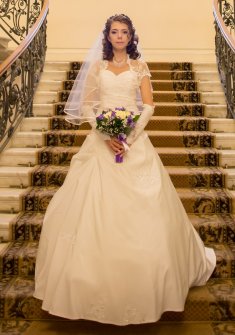 свадебное атласное платье с пышной юбкой, кринолином, стразами, цвет айвори, брала на 42 размер, но как мне объяснил продавец при покупке, оно может растягиваться до 48 размера за счет затягивания корсета. В этом платье была только в загсе, после надела другое. Покупалось на рост 162+9 см каблук. Платье чистое, после химчистки.