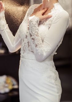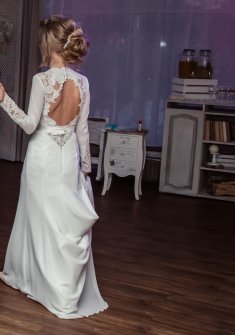 красивое счастливое платье цвета айвори с длинным шлейфом, который можно крепить на кнопку. Открытая спина, кружево. После химчистки, в чехле. В подарок новая фата