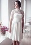 Изящное свадебное платье в ретро-стиле. Юбка с мягкими складками струится по фигуре и акцентирует внимание на стройных, грациозных ножках невесты. Гладкий лиф продолжается прозрачной вставкой с рукавами, отделанной крупным кружевом, которое смотрится как шикарное ожерелье. Это роскошь, доступная каждому! Данная модель представлена в двух цветах.
