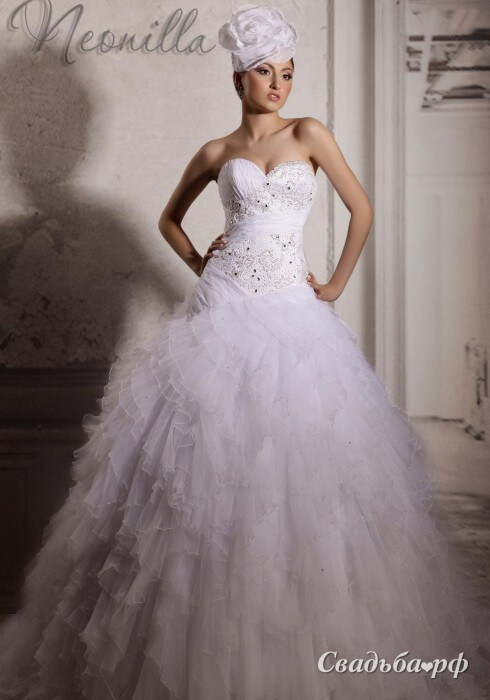 Элегантное свадебное платье с удлиненным корсетом , отделанным вышивкой и сверкающими бусинами, обратит внимание на красивые плечи, соблазнительную форму бюста , тонкую талию и грациозную линию бедер. Пышная многослойная юбка из фатина создаст легкий парящий силуэт, а ее шлейф дополнит романтичный нежный образ. Это роскошь, доступная каждому!