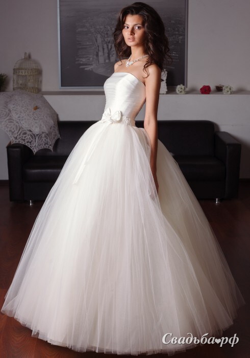 Традиционное свадебное платье с атласным корсетом и пышной юбкой. Оно словно создано для того, чтобы воплотить в жизнь заветную мечту каждой девушки - почувствовать себя принцессой. Прямая линия корсета подчеркнет красивую линию плеч и зону декольте. Пояс с романтичным бантом дополняет силуэт платья и создает акцент на талии. Эта роскошь, доступная каждому!