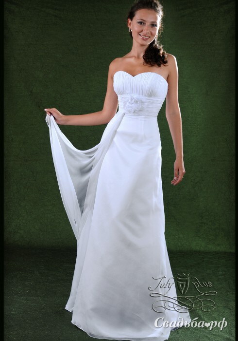 Кокетливое нежное свадебное платье. При его изготовление использовались такие ткани, как атлас и шифон. Мелкая горизонтальная драпировка на лифе и длинная юбка А-силуэта визуально удлинят фигуру и подчеркнут хрупкость невесты. Верхний слой юбки, выполненный из прозрачной ткани, можно грациозно взять в руку. Это роскошь, доступная каждому!
