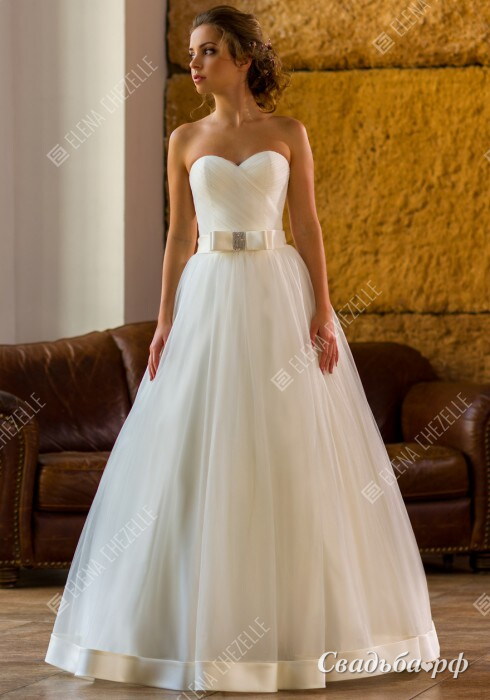 Покрой представленного платья традиционен - классический корсет и пышная юбка. Но вся его прелесть - в деталях! Лиф изящно задрапирован и подчеркивает женственные формы. Талия акцентирована атласной лентой с крупным бантом лаконичной формы. Пышная юбка из фатина отделана по низу атласным краем. Декор элегантен и ненавязчив. Это роскошь, доступная каждому!