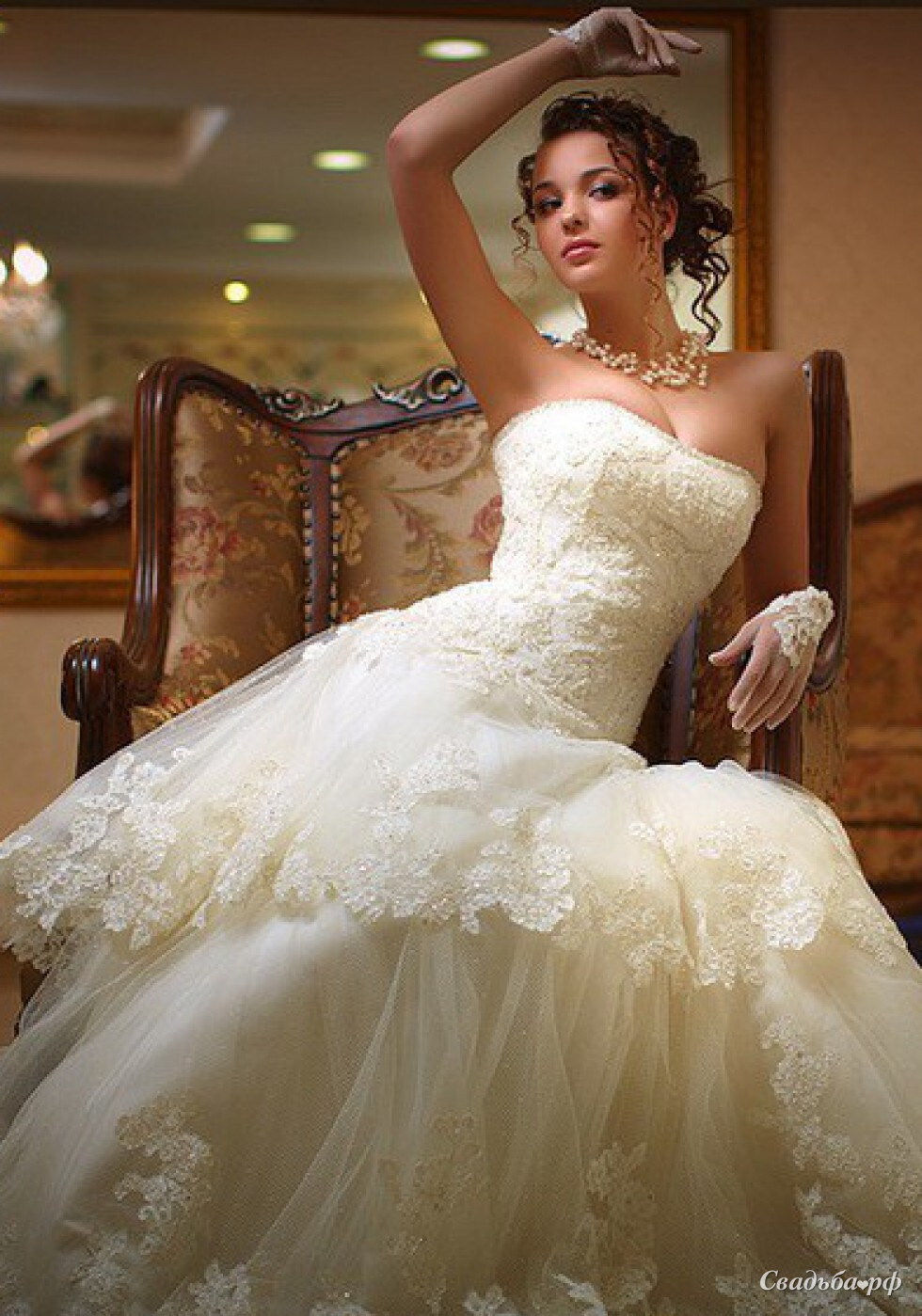 Классическое свадебное платье с подчеркивающим фигуру верхом и пышным низом. Изюминку ему придает двухслойная объемная юбка, отделанная шикарным крупным кружевом, плавно переходящая в сдержанный шлейф. Низкая посадка корсета на спине и строгая линия в зоне декольте обратит внимание на красивые плечи и хрупкость невесты. Это роскошь, доступная каждому!