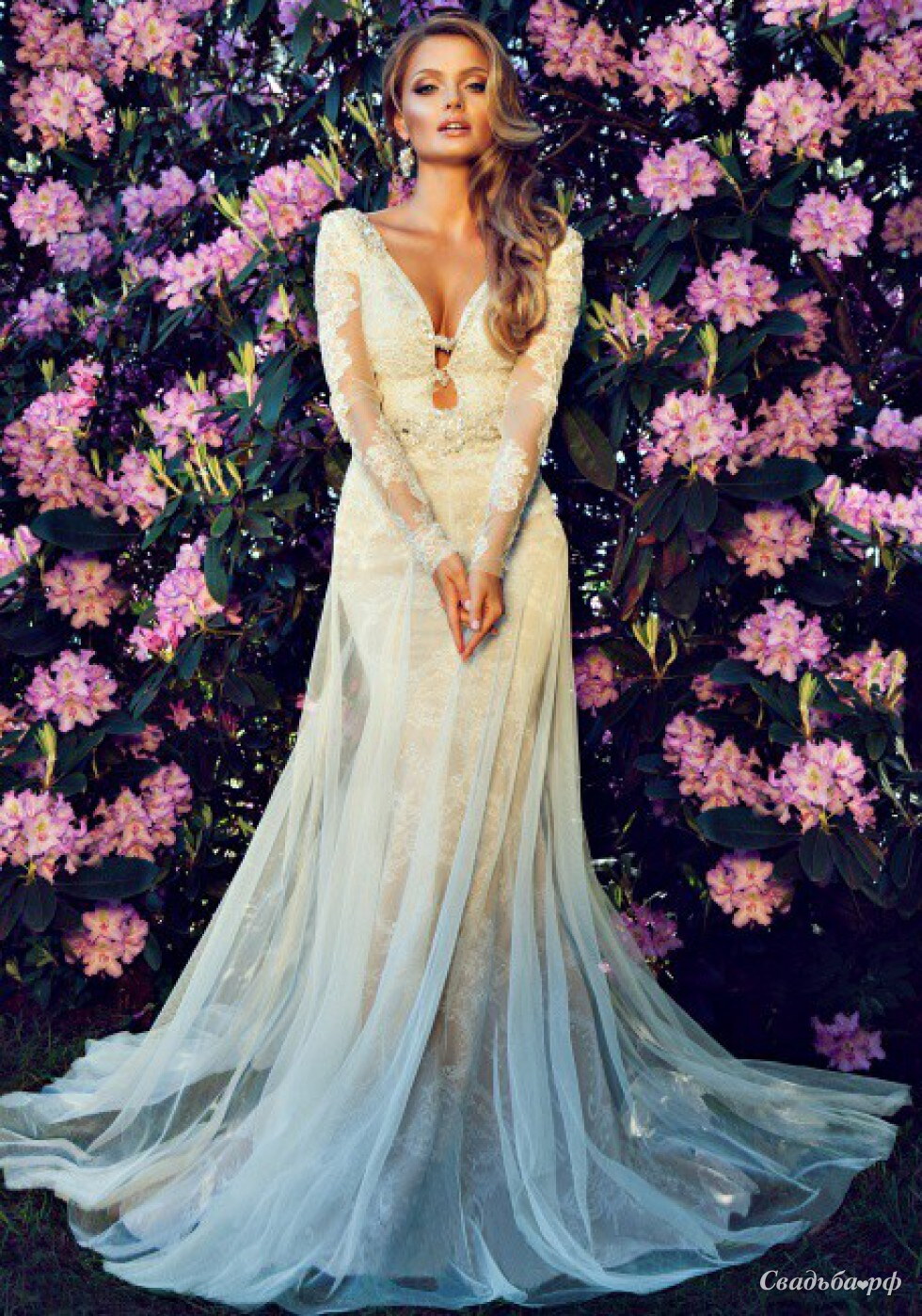 Силуэтное платье, в основе которого лежит кружево шантильи на пудровой основе. Декольте и пояс украшен ручной вышивкой.