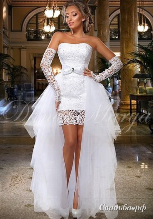 Современный комплект - необычный и шикарный вариант для настоящей невесты-модницы! Обтягивающее свадебное платье с оригинальной фактурой доходит до середины бедра. Лёгкая юбочка-шлейф из полупрозрачной ткани при желании отстёгивается. В наличии белые и кремовые варианты. Шьем наряд в любом размере и цвете. Стоимость не меняется!