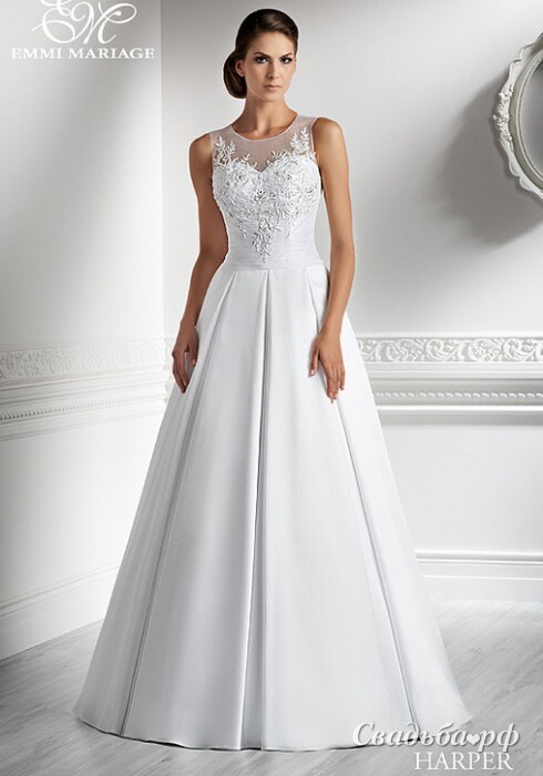 Элегантное свадебное платье с закрытой спинкой и полупрозрачной вставкой на груди выполнено из благородного атласа высочайшего качества. Корсет украшен вышивкой. Длинная юбка с широкими складками-клиньями смотрится необычно. В наличии белый наряд размера 44-46. Под заказ доступен любой цвет и размер: срок пошива 3-5 недель.
