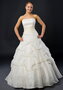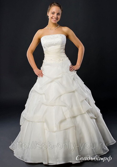 Романтичное свадебное платье с открытой зоной декольте выполнено из органзы. Корсет украшен сверкающей вышивкой и лёгкими сборками драпировки на талии. Длинная юбка с объёмными сборками струится до пола и гармонично дополняет этот царственный образ. Наряд акцентирует внимание на оголённых руках. В наличии представлены белые и кремовые модели.