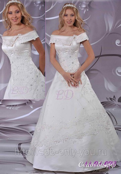 Великолепное свадебное платье из атласа и расшитого вручную кружева выполнено российскими дизайнерами. Открытая зона декольте и приспущенные плечики придают образу романтичность и трогательность. Широкая окантовка корсета переходит на короткие рукавчики. Кружево с корсета словно стекает на верхнюю часть длинной юбки. Наряд расширяется к полу.