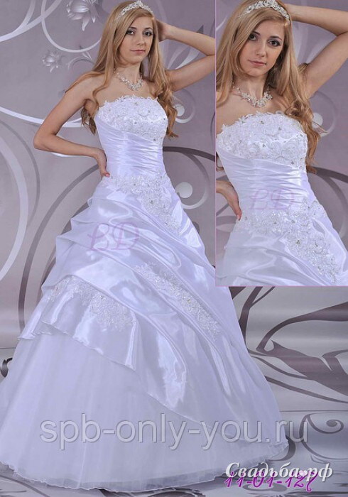 Белоснежное свадебное платье представлено лучшими дизайнерами России. Драпированный корсет с открытой зоной декольте и искусной вышивкой гармонично сочетается с пышной юбкой. Подол на одном боку украшен объёмными сборками. Подъюбник выполнен из полупрозрачной ткани. Воздушный наряд А-силуэта станет изюминкой Вашего свадебного образа.