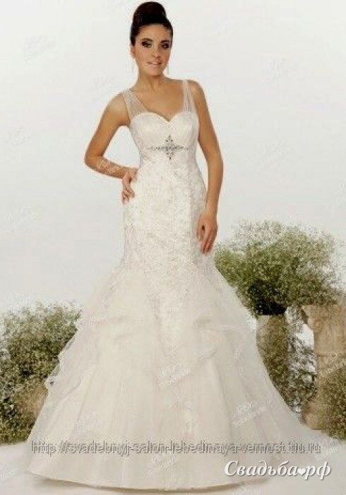 Роскошный свадебный наряд силуэта Русалочка дополнено полупрозрачными бретелями. Заниженный корсет с расшитым вручную кружевом декорирован сверкающей вышивкой под грудью. Наряд облегает фигуру и постепенно расширяется к полу. Пышная часть юбки с воланами выполнена из фатина. В наличии представлено свадебное платье цвета айвори 44 размера.