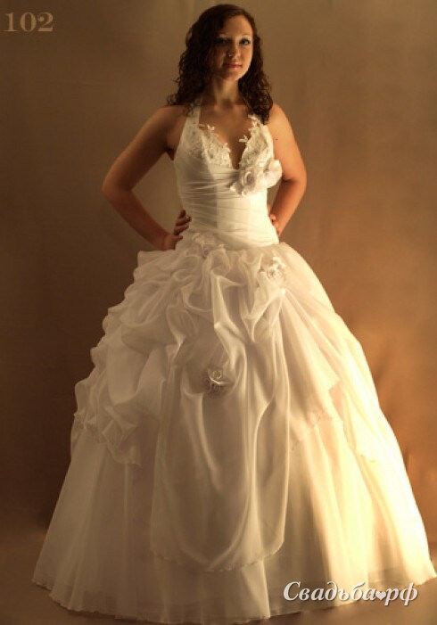 Классический А-силуэтный наряд от украинских дизайнером подчеркнёт талию и бюст невесты. Глубокий V-образный вырез на груди обрамлён широкими бретелями с вышивкой. Грудь украшена цветами ручной работы. Пышная юбочка декорирована сборками и несколькими бутонами роз. В наличии представлено свадебное платье белого цвета 44-46 размера.