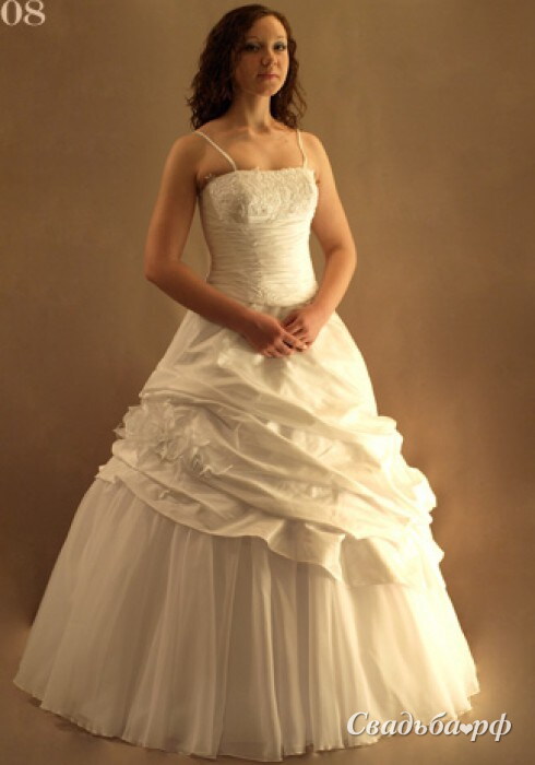 Романтичный свадебный наряд украинского производства понравится нежным красавицам. Открытая зона декольте обрамлена тончайшими бретелями. На груди разместилась объёмная вышивка. Талия подчёркнута лёгкими складками драпировки. Пышная юбка с воздушными сборками дополнена цветами на боку. В наличии представлено белое свадебное платье 40-42 размера.