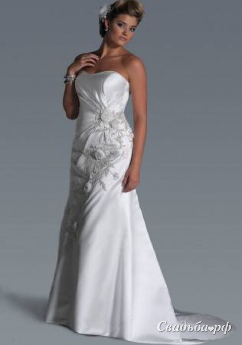 Американский свадебный наряд с оголённой зоной декольте украшено тонкой вышивкой и цветами ручной работы. Модель облегает фигуру и постепенно расширяется к полу, переходя в кокетливый шлейф. Длинная юбка визуально удлиняет фигуру. Стильный и женственный наряд. В наличии представлено свадебное платье цвета айвори 46 размера.