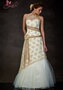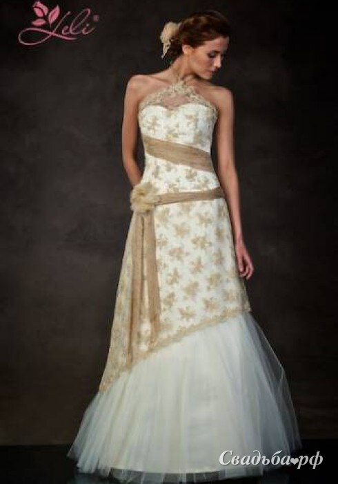 Белоснежный свадебный наряд отечественного производства драпирован золотистым кружевом. Ажурная вставка на груди переходит в тоненькую бретель-петлю вокруг шеи. Косрет и бёдра пересекает лента с цветком ручной работы. Юбка выполнена из лёгкого фатина. В наличии свадебное платье цвета айвори с золотыми деталями, 44 размера.