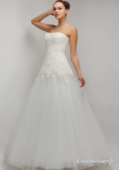 Роскошный А-силуэтный наряд от известного отечественного бренда Topaza Pella создан для самой стильной и изысканной модницы. Плотный корсет с открытой зоной декольте украшен кружевом, словно стекающим на верхнюю часть пышной юбки. Подол платья поражает своей лёгкостью и воздушностью: множество слоёв полупрозрачной ткани способствуют этому.