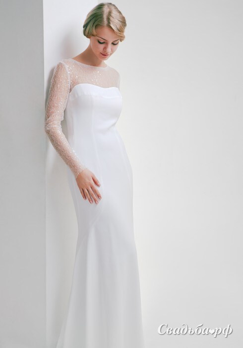 Изысканное свадебное платье от именитого отечественного бренда Topaza Pella приковывает все взгляды окружающих с первой секунды. Вставка на груди и длинные рукава выполнены из переливающегося кружева. Платье идеально садится по фигуре и подчёркивает женственные изгибы. От уровня колен юбка слегка расширяется. Стильный наряд для леди!