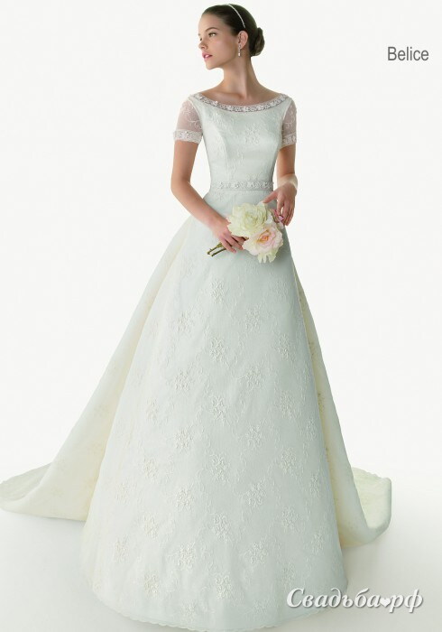 Милое А-силуэтное свадебное платье от испанского бренда Rosa Clara поможет создать романтичный образ невесты. Вырез-лодочка на груди, края коротких рукавчиков и талия украшены тончайшей вышивкой ручной работы. Длинная юбка дополнена поистине королевским шлейфом, начинающимся от поясницы. Платье декорировано ажурными вставками по всей длине.