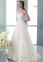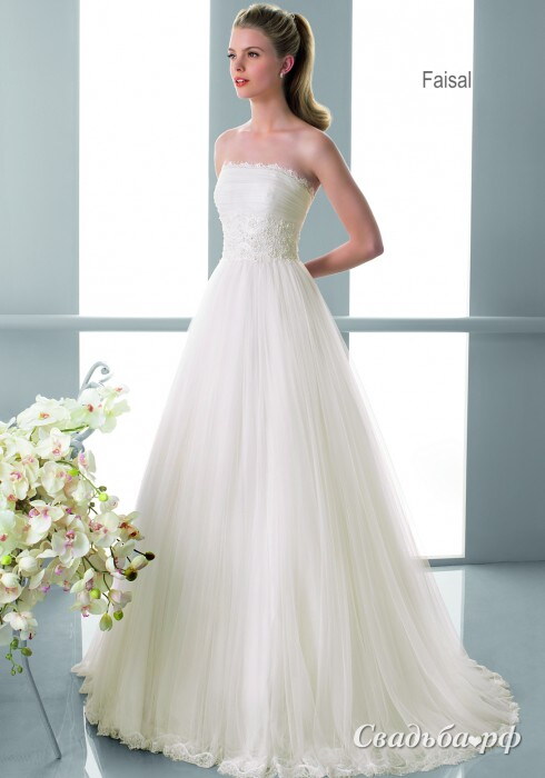 Королевский наряд от испанского бренда Rosa Clara акцентирует внимание на оголённых плечиках и открытой зоне декольте. Миниатюрный корсаж с цветочной вышивкой и ажурным верхним краем подчёркивает талию. Пышная юбка со множеством складок из полупрозрачной ткани по краю окантован более плотной материей. Лаконичный образ для настоящей леди.