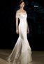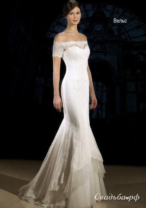 Романтичный свадебный наряд с открытой зоной декольте и приспущенными плечиками представлен отечественным брендом Topaza Pella. Верхний край корсета и короткие рукавчики выполнены из тонкого кружева. Наряд великолепно садится по фигуре и деликатно облегает силуэт. От середины бедра юбка расширяется и переходит в шлейф.