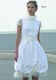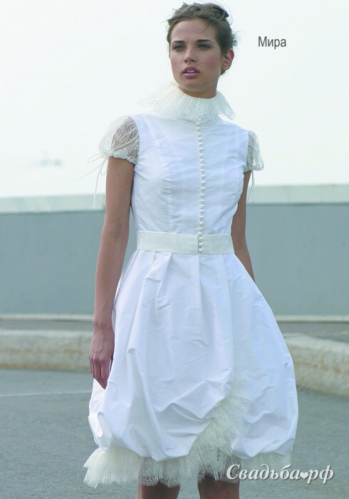 Оригинальное свадебное платье с закрытой зоной декольте и необычным воротником из полупрозрачной ткани. Короткие рукавчики из кружева и целый каскад пуговок на корсете придают образу невинность. Талия подчёркнута поясом. Объёмная юбка с кружевным поъюбником приоткрывает колени. Нестандартный образ для стильной невесты.
