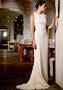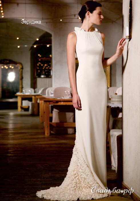 Изысканное свадебное платье от российского бренда Topaza Pella идеально садится по фигуре и подчёркивает женственный силуэт. Закрытая зона декольте с несколькими складками и отворотами воротничка помогает создать элегантный и целомудренный образ. Длинная юбка прямого кроя переходит в необычный шлейф со множеством сборок.
