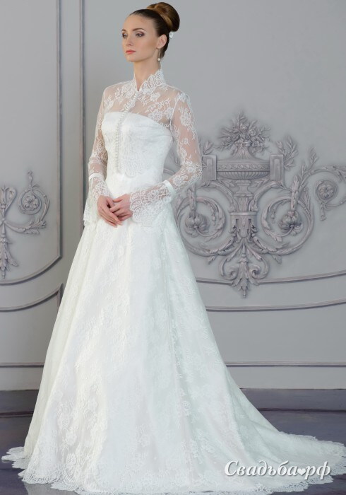 Супер модный свадебный наряд - корсетное свадебное платье А-силуэта из элитного атласа с открытой зоной декольте и роскошное болеро с длинными рукавами и из тончайшего кружева шантильи с жемчужными пуговицами. Свадебный комплект может быть дополнен фатой с кружевом шантильи.