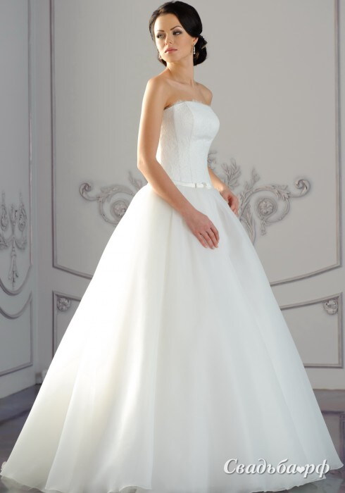 Удивительно изысканное свадебное платье. В нем все смотрится прекрасно: пышная юбка из матовой органзы, заложенная бантовыми складками. Совершенные линии корсета, тончайшее кружево, изящный почс и маленьким бантом, а в середине банта искрятся кристаллы хрусталя