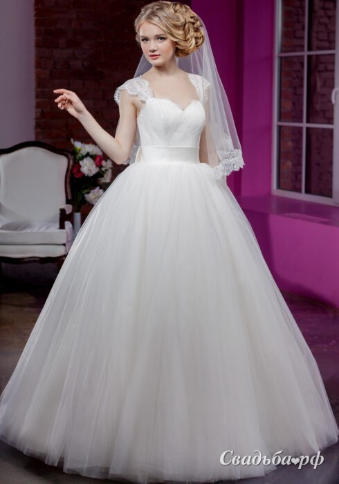 Пышное свадебное платье с кружевными лямками, кокетливым бантом на юбке