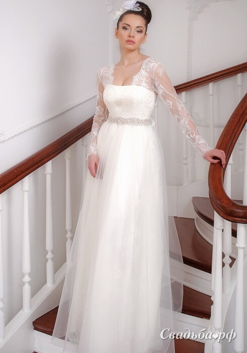 Нежное свадебное платье без кринолина из тончайшего кружева с чуть завышенной талией и длинными рукавами.