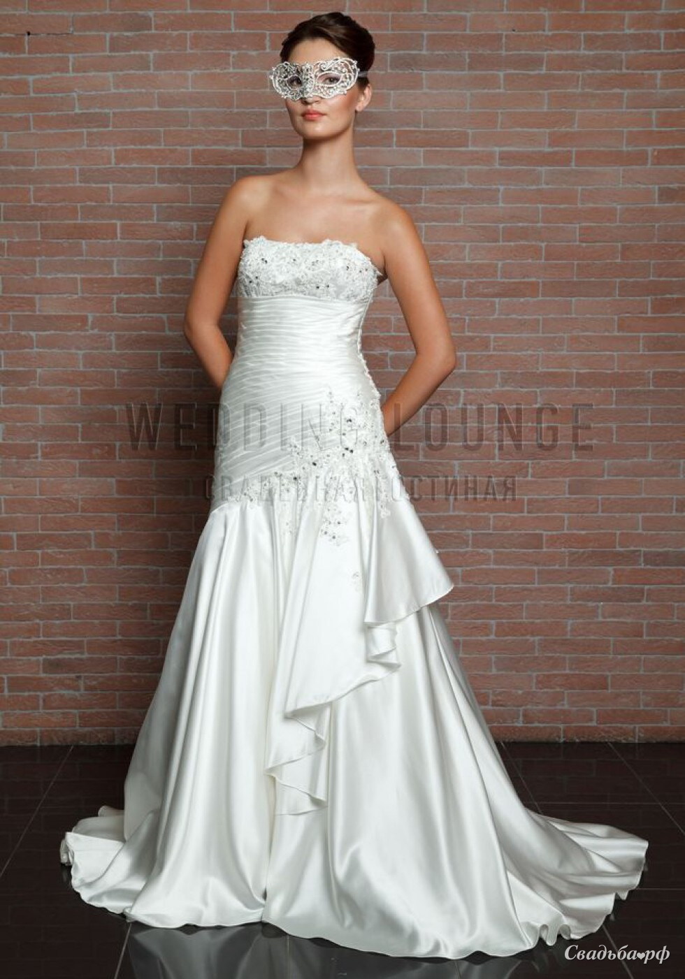 Изящный свадебный наряд с декольтированным корсетом выполнен из атласного сатина. Наряд переливается в лучах света. Заниженный корсет с тонкими сборками украшен сверкающей вышивкой по верхнему и нижнему краям. От середины бедра начинается пышная юбка с вертикальным воланом и кокетливым шлейфом. Наряд идеально садится по фигуре.