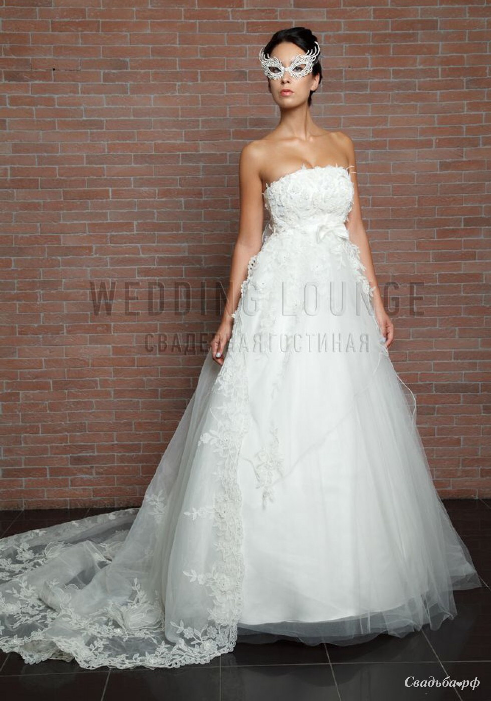 Лиф платья украшен нежными цветочками и изысканными узорами из органзы и жемчуга, этот орнамент переходит и на юбку в виде воздушных стебельков и листочков. Роскошный шлейф, который может быть использован и в качестве фаты переходящей в шлейф, идеально смотрится на свадьбе с венчанием или во дворце, в то время как для прогулки по парку или на торжественном приеме шлейф можно легко отстегнуть.