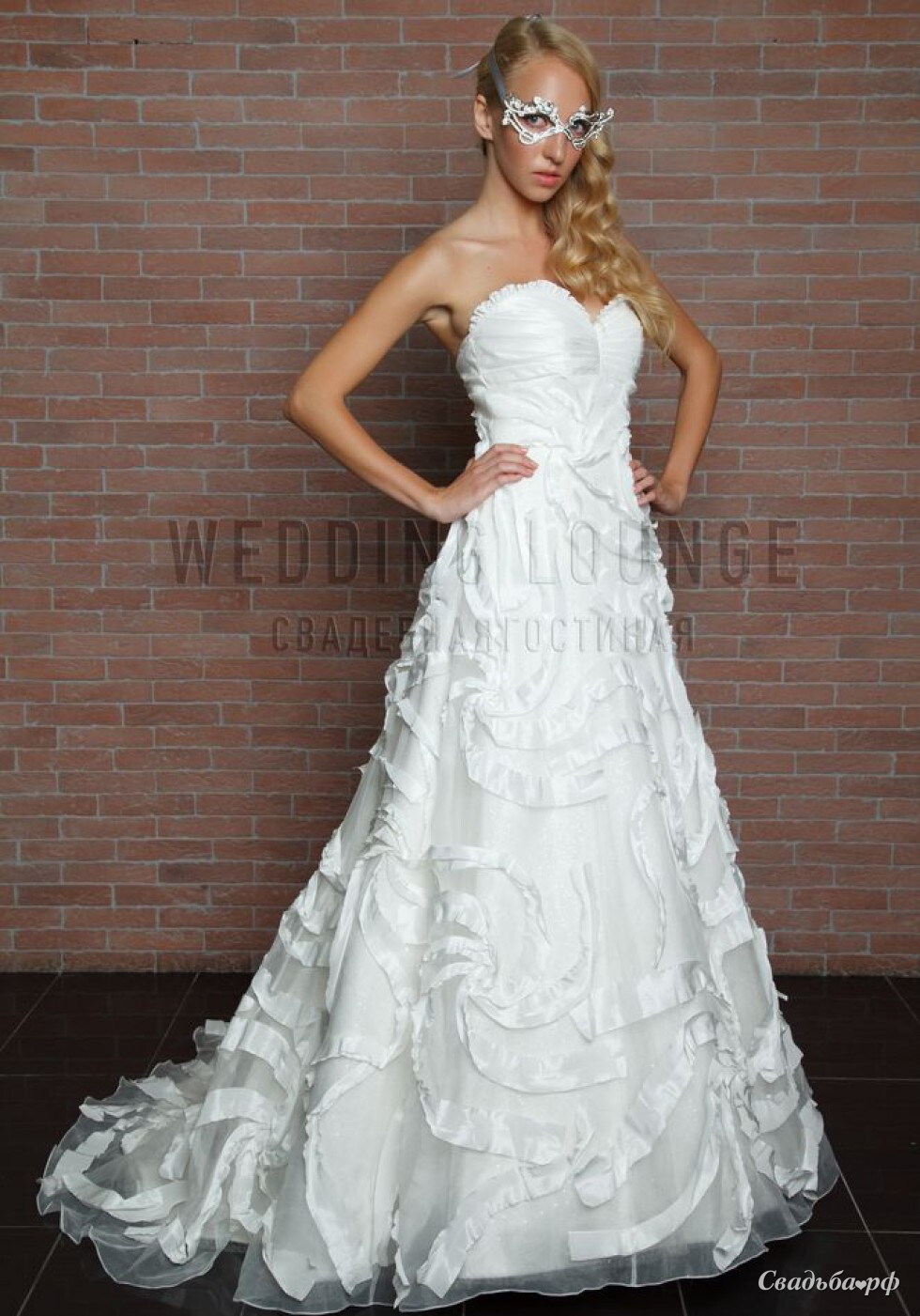 Это свадебное платье визуально стройнит и прибавляет несколько сантиметров к росту невесты. Форма лифа выгодно подчеркивает грудь. Длинная юбка с полупрозрачным верхним слоем и необычным орнаментом из более плотной ткани постепенно расширяется к полу. Кокетливый шлейф гармонично дополняет этот женственный образ. Вы будете неотразимы!