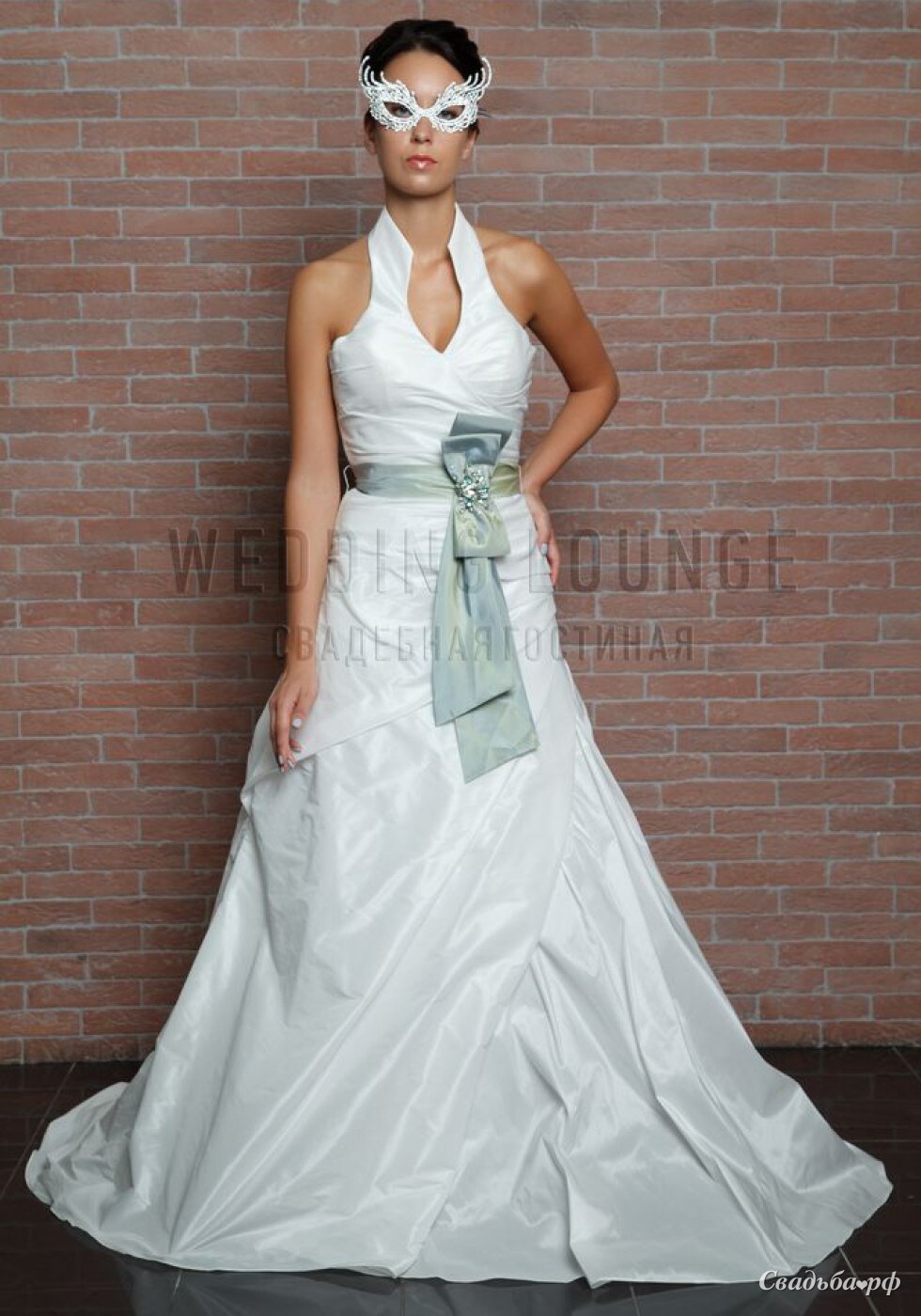 Стильное свадебное платье английского производства безупречно во всем! Необычный воротничок-стойка поражает своей деловитостью, но при этом сам образ нежен и прекрасен. Изящный пояс цвета хамелеон придаёт наряду особый шик. Оголённые плечики и небольшой вырез на груди смотрятся игриво. Длинная юбка со сборками расширяется к полу.