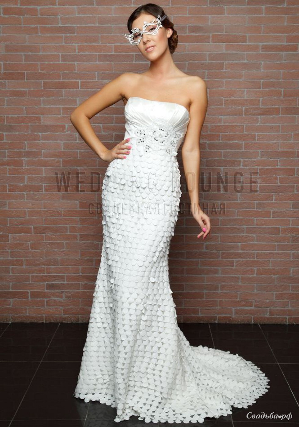 Мечтаете об оригинальном образе? Тогда это свадебное платье английского производства создано для Вас! Облегающий наряд с соблазнительной зоной декольте идеально садится по фигуре. Завышенная талия украшена аппликацией в форме розы. Длинная юбка со шлейфом декорирована миниатюрными лепестками, благодаря чему получается необычная фактура.