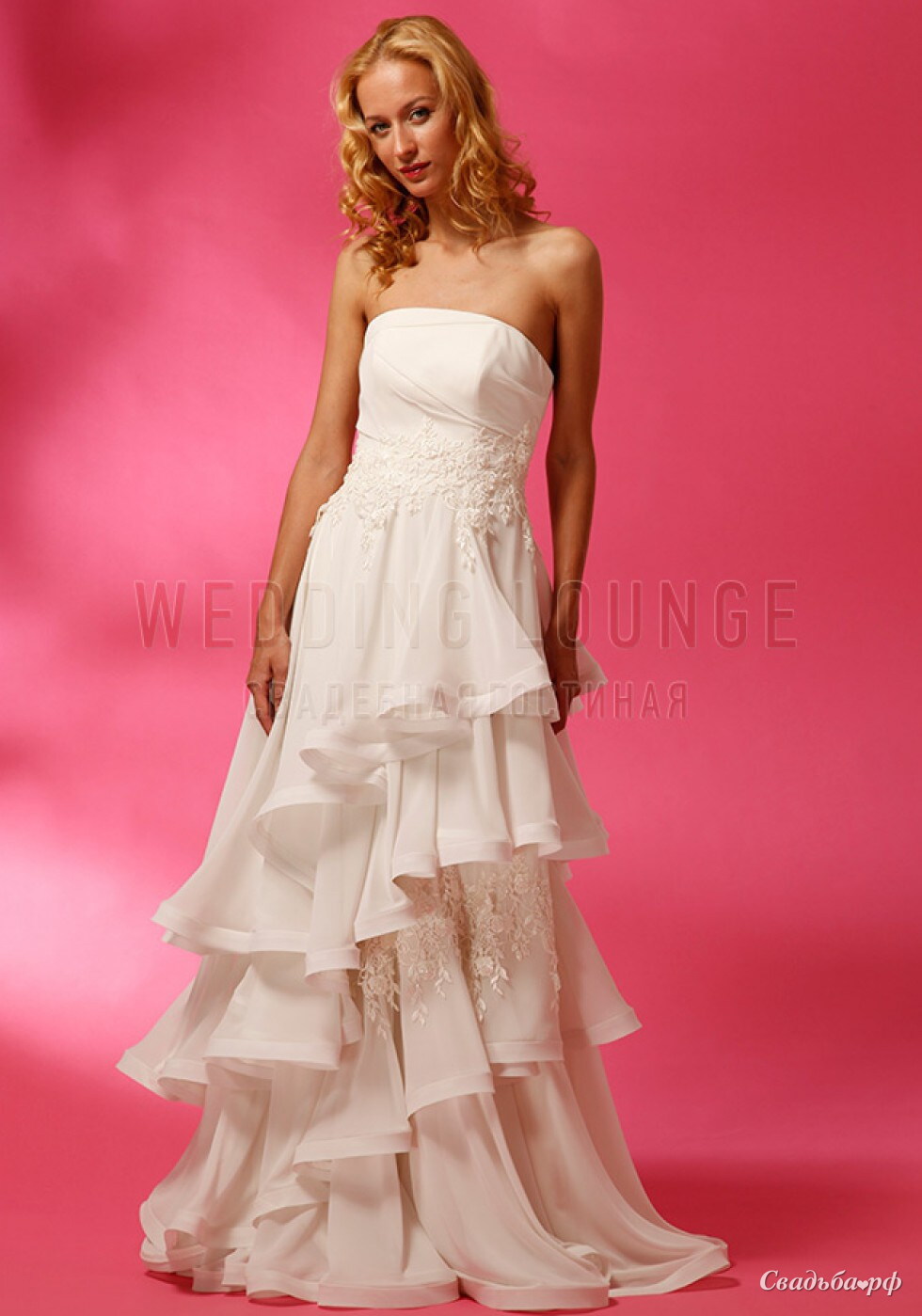 Нежный наряд из японского шифона станет изюминкой Вашего свадебного образа. Декольтированный корсет с тонкой драпировкой идеально садится по фигуре. Талия украшена ажурной аппликацией. Длинная юбка с несколькими ярусами воздушных воланов расширяется к полу и переходит в небольшой шлейф. Наряд от японских дизайнеров никого не оставит равнодушным.