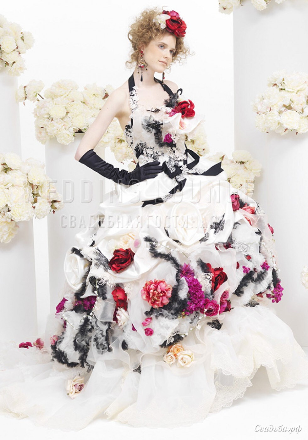 Самым креативным невестам японские дизайнеры представляют этот свадебный наряд из микадо, органзы и кружева. Декольтированный корсет с бретелью-петлёй идеально садится по фигуре. Пышная юбка с объёмными сборками и шлейфом придаёт образу воздушность. Изюминкой модели является оригинальное сочетание цветов и обилие декора.