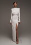 Стильное прямое свадебное платье с высоким разрезом вдоль ноги. Коллекция 2025 года