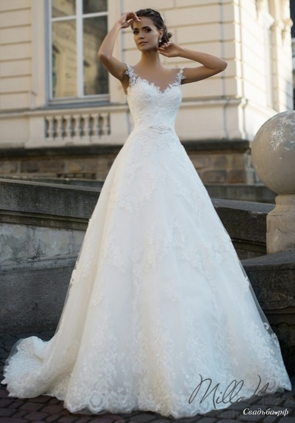 Свадебное платье Avril классического А-силуэта имеет небольшой шлейф и изысканно декорированную кружевом спинку.