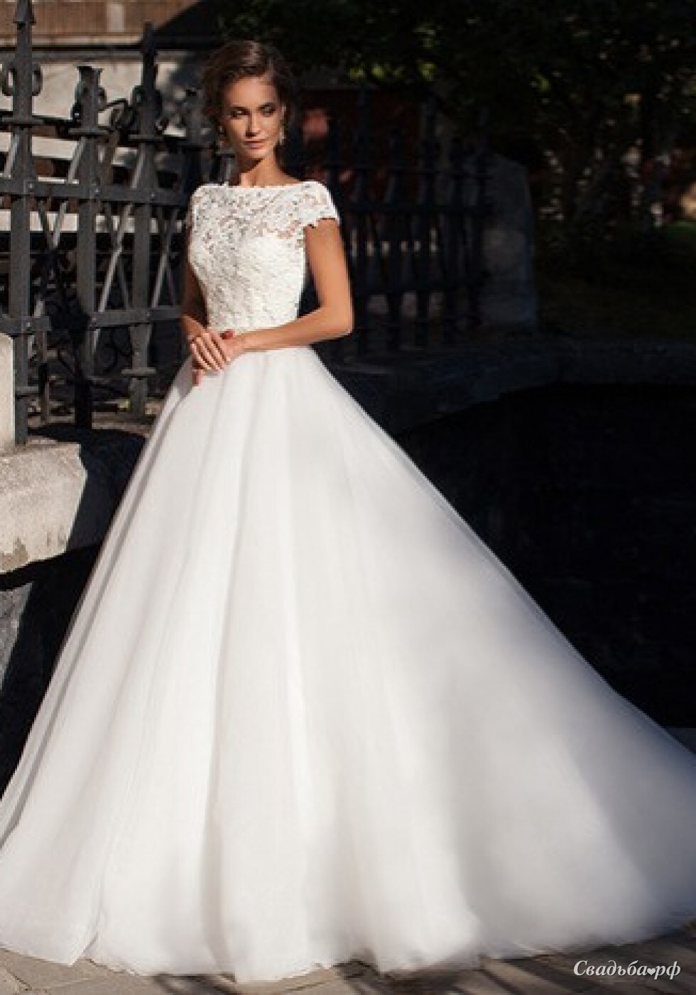 Свадебное платье Eva классического силуэта "принцесса" смотрится торжественно и романтично. Лиф украшен тканью с крупным кружевным узором. Область декольте закрыта. Пикантные ноты добавляет соблазнительно открытая спинка.