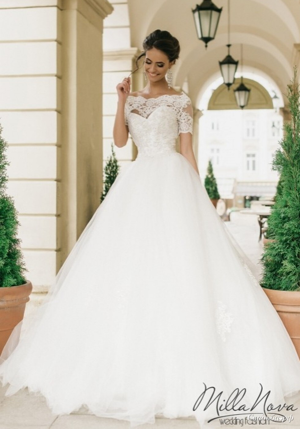 Свадебное платье Florence - романтичная и очень женственная модель. Легкая ткань многослойной пышной юбки придает образу воздушность. Лиф с короткими рукавами выполнен из кружевной ткани. Плотный корсет помогает сделать акцент на талии.
