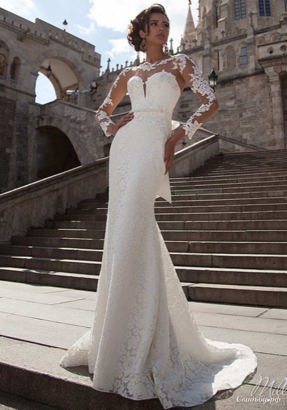 Свадебное платье Ivon прямого силуэта помогает создать соблазнительный и волнующий образ. Платье смотрится необычайно эффектно благодаря глубокому декольте и изящному кружевному узору, украшающему рукава и спинку из прозрачной сетки.