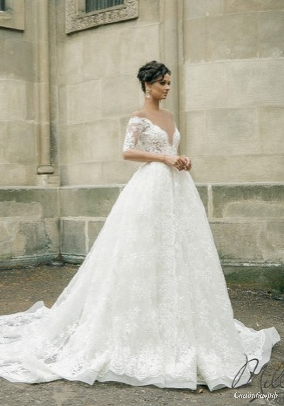 Свадебное платье Margarita отличается эффектным и длинным кружевным шлейфом. Кружевной лиф имеет глубокое декольте и рукава до локтя. Платье создает обольстительный и женственный образ.