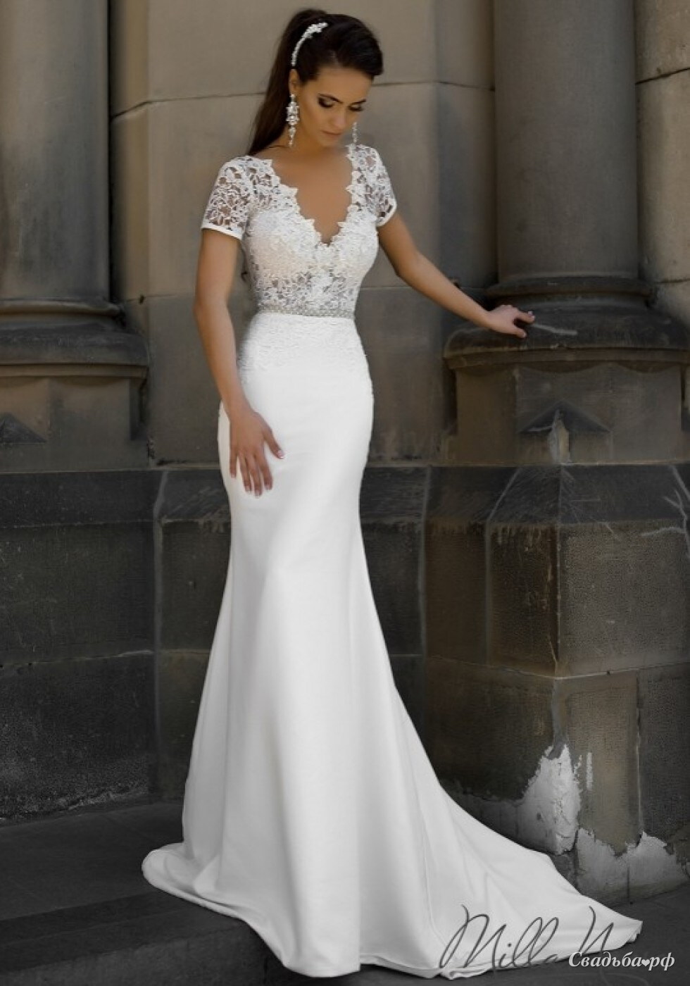 Свадебное платье Nadina прямого облегающего силуэта помогает создать легкий и изящный образ, который будет гармонично смотреться на уютной и романтичной свадьбе. Кружевной лиф и юбка, которая расширяется к полу и образует красивый небольшой шлейф, придают образу праздничность и делают его еще эффектнее.