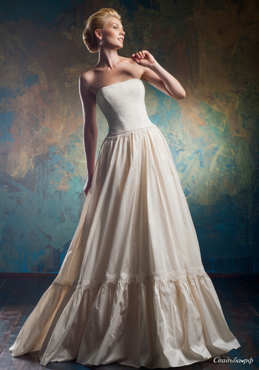 Необычное платье с плотным корсетом и пышной юбкой. Геометрический узор кружева уравновешен легкомысленным воланом юбки. Необычное, но очень запоминающееся платье.