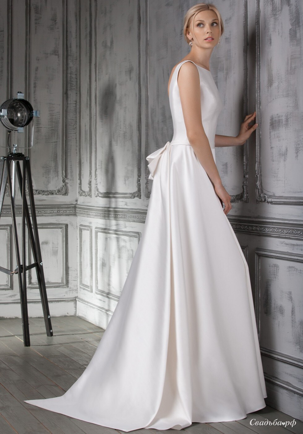 Это платье - настоящее произведение искусства: нежный струящийся шелк, глубоко открытая спина и длинный шлейф. Это лаконично платье придется по вкусу тем, кто ценит роскошь минимализма.