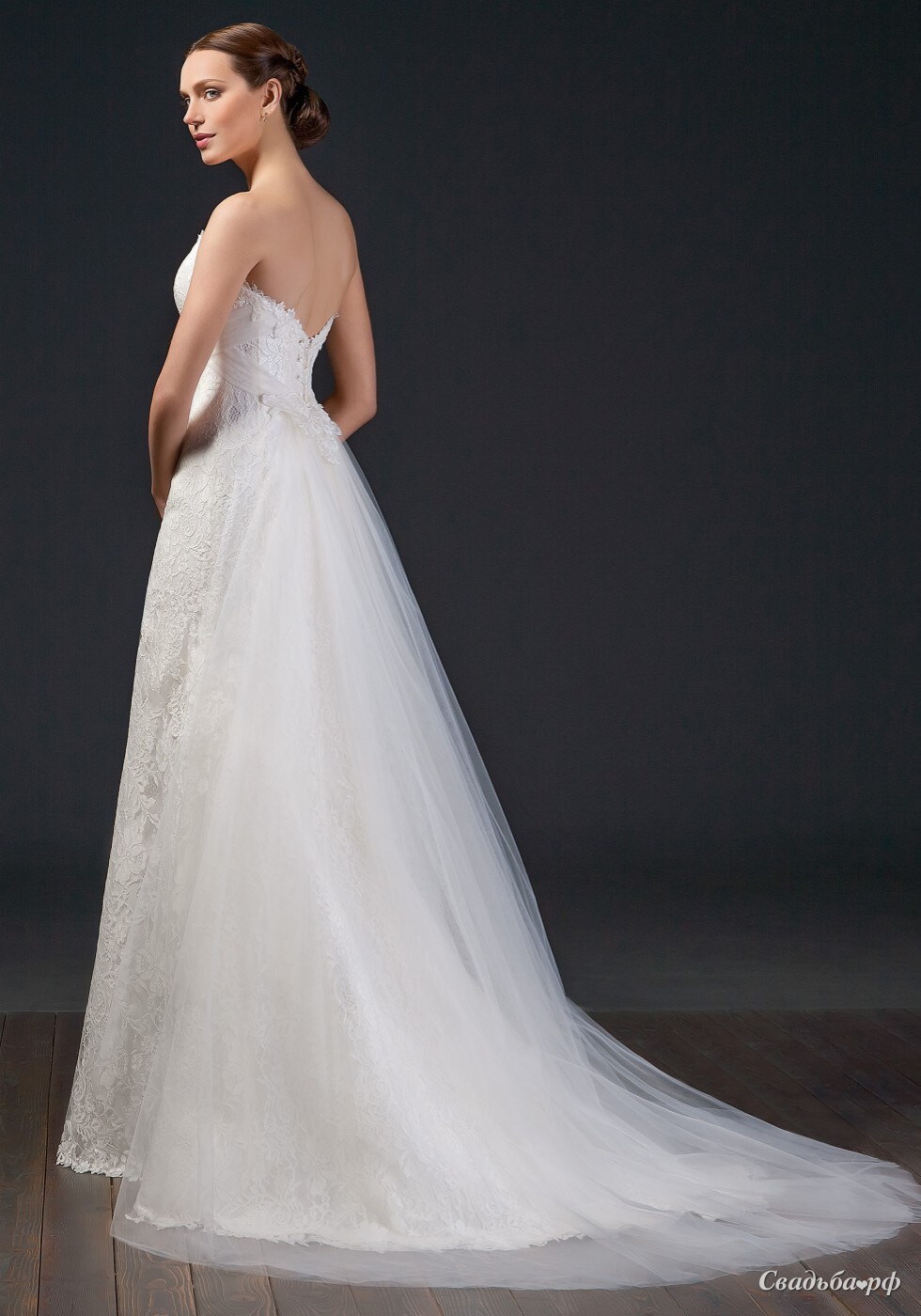 Очаровательное и женственное платье с мягким узорным кружевом и шикарным фатиновым шлейфом. Плавные линии и легкие кружева этого силуэтного платья подчеркнут достоинства фигуры, а съемный шлейф станет прекрасной идеей для необычной фотосесии.